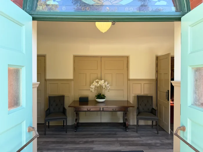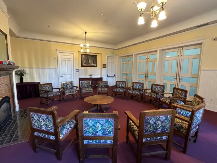 Your group is welcome to gather in the parlor-style Fireside Room, featuring an upright piano, beautiful wainscoted walls, and a gorgeously maintained barrel ceiling. It also features a wooden fireplace as well as notable antique touches throughout, like an intricately carved buffet for refreshments. With many different rooms available, this is the perfect venue for your special occasion.