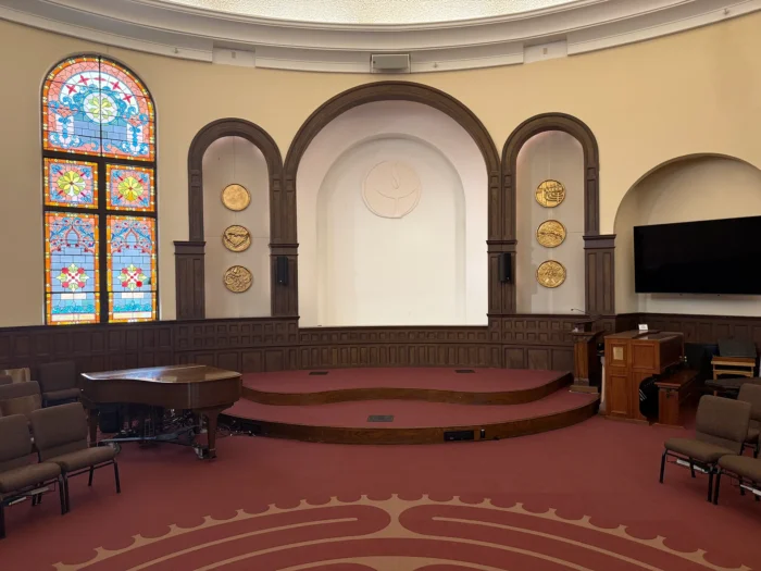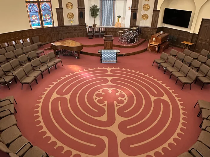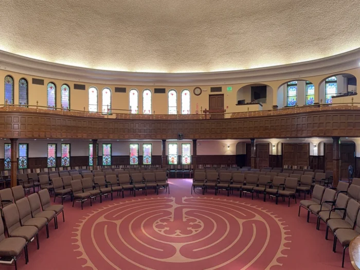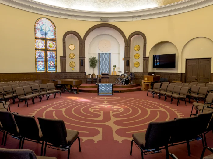 The circular-shaped sanctuary includes dozens of floral stained-glass windows on both the main floor and mezzanine which create dazzling light displays throughout. Seating consists of wooden rows with a charming patina. The triple-arched chancel overlooks the intricately designed labyrinth. A Steinway Baby Grand piano and Galanti Organ add additional elegance to the space.